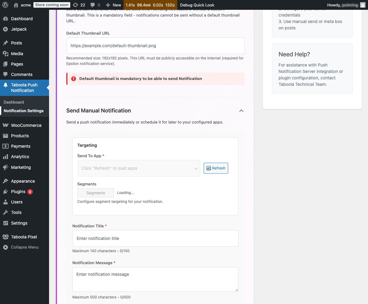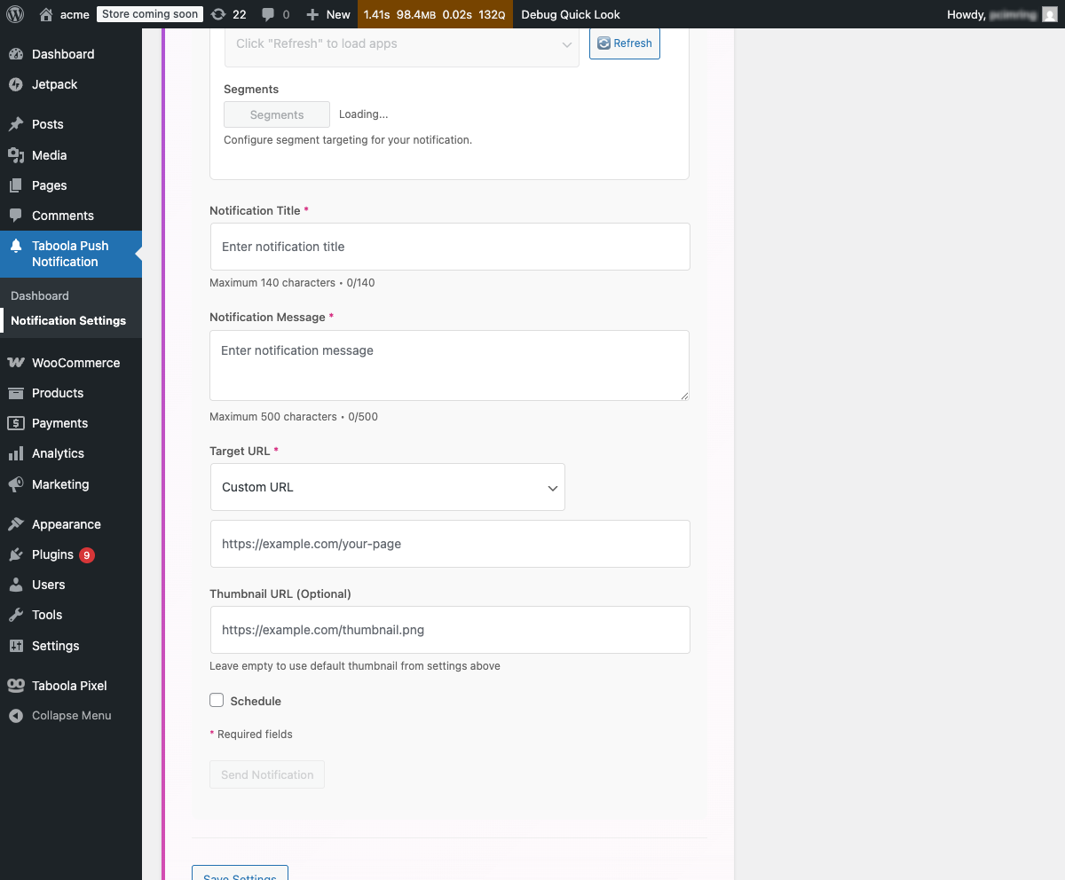 Notification Title(required, 140 characters max)Notification Message(required, 500 characters max)Target URL(required): SelectCustom URL, πHomepage, or a recent post/pageThumbnail URL(optional): Custom image URL, or leave empty for default