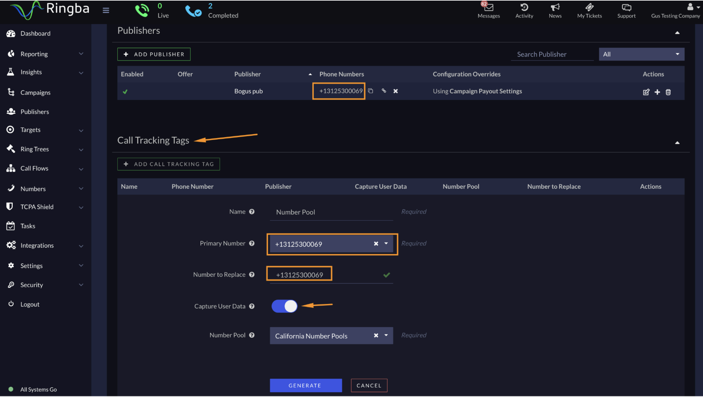 Once you have this, under the Call Tracking Tags click on Add Call Tracking Tags. Select the same number that was attached to the publisher under the Primary Number as well as in the Number to replace, and finally turn on Capture User Data and select the Number Pool you created before. Click on Generate.