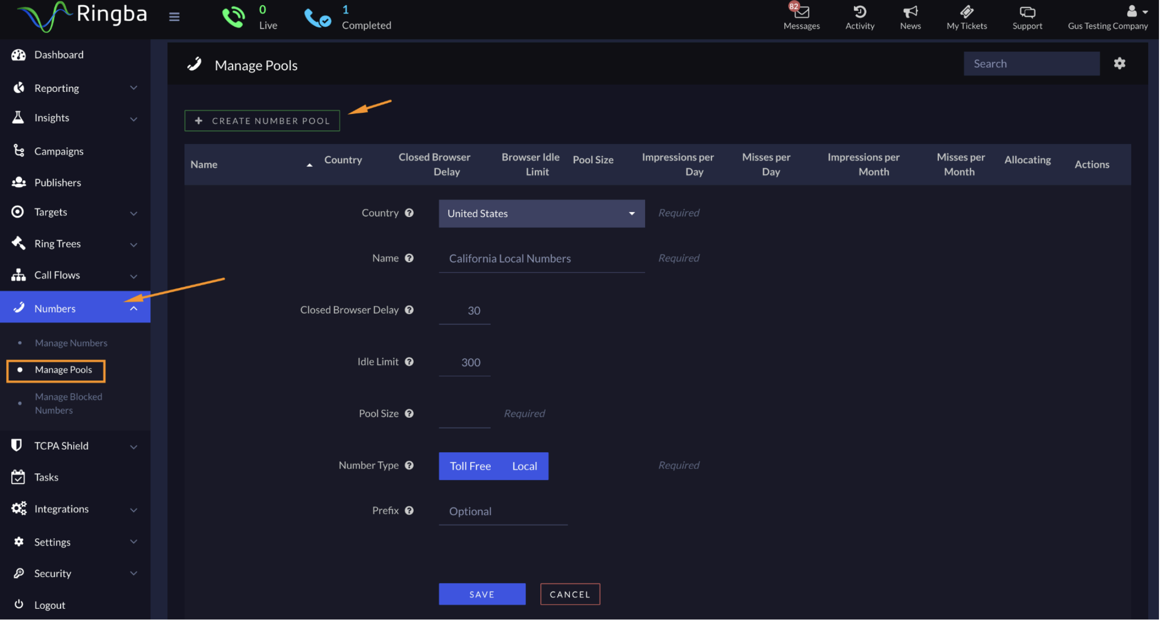 Navigate to the left side menu, select Numbers → Manage Pools and click on Create Number Pool. This will give you the options to allocate the number pool. This is the pool of numbers that will be shown to the user on the landing page.