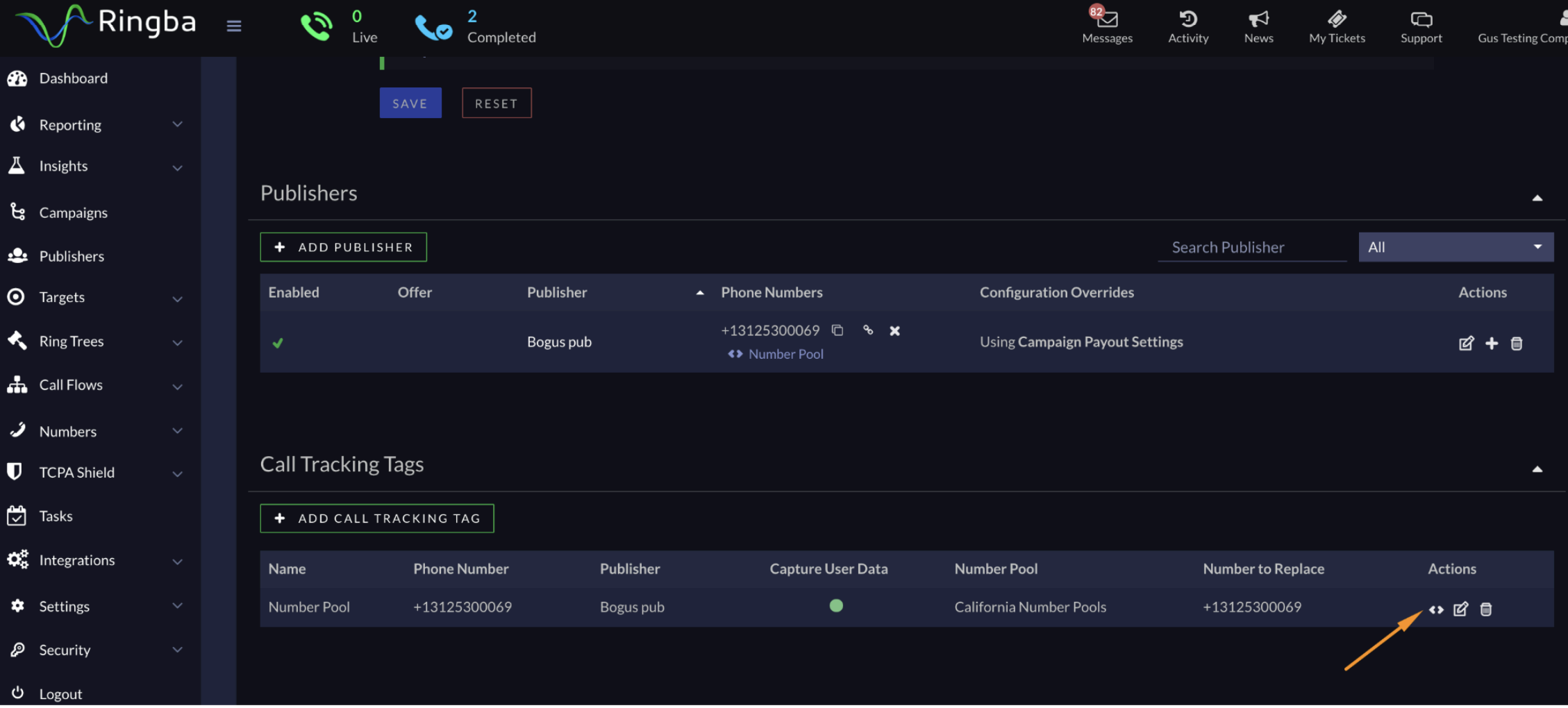 Share the snippet with your publisher, who will then need to integrate it into the landing page. Once the snippet is embedded, ensure the landing page includes a placeholder for the Number to replace. This placeholder will be dynamically updated with the pool number by our code. When a visitor calls the displayed number, all relevant information for that impression will be linked to the call as Tags. For detailed instructions, refer to Ringba's Help Center.