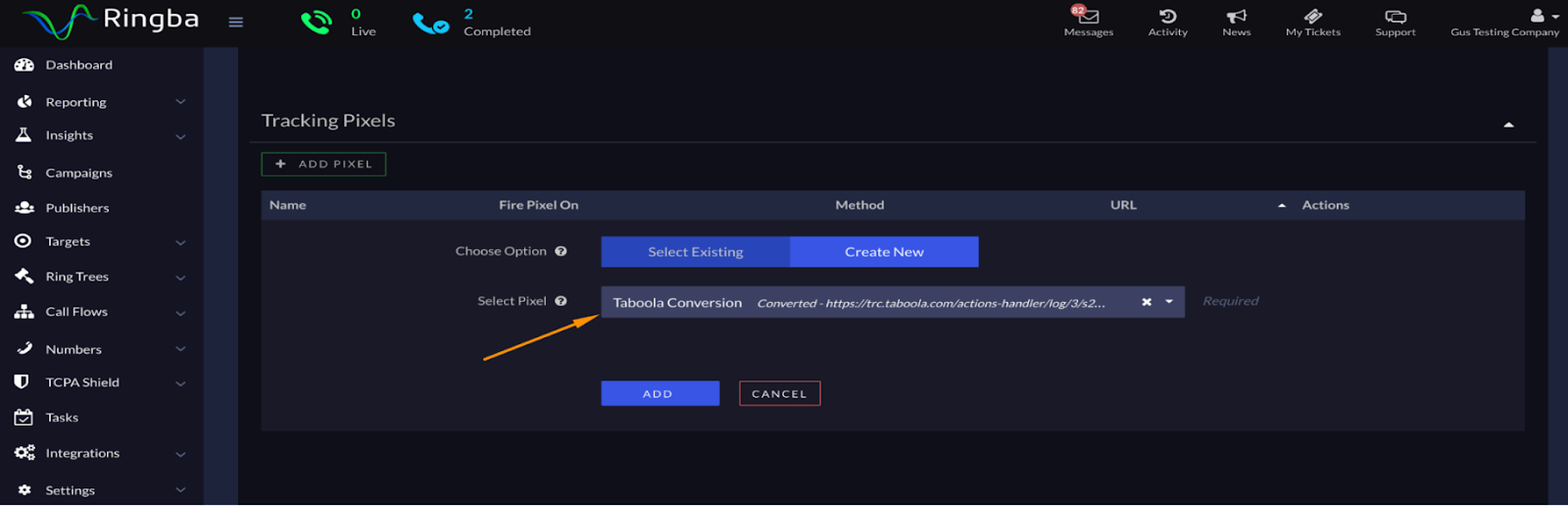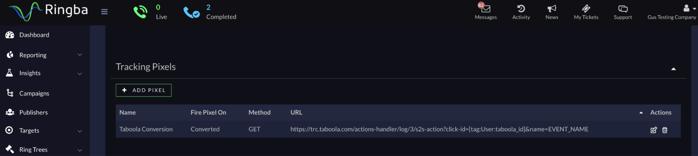 Once the landing page is working correctly (you get the Taboola Click ID or any other needed parameter in the URL on Ringba as described in the previous step) connect Taboola to Ringba using a pixel.