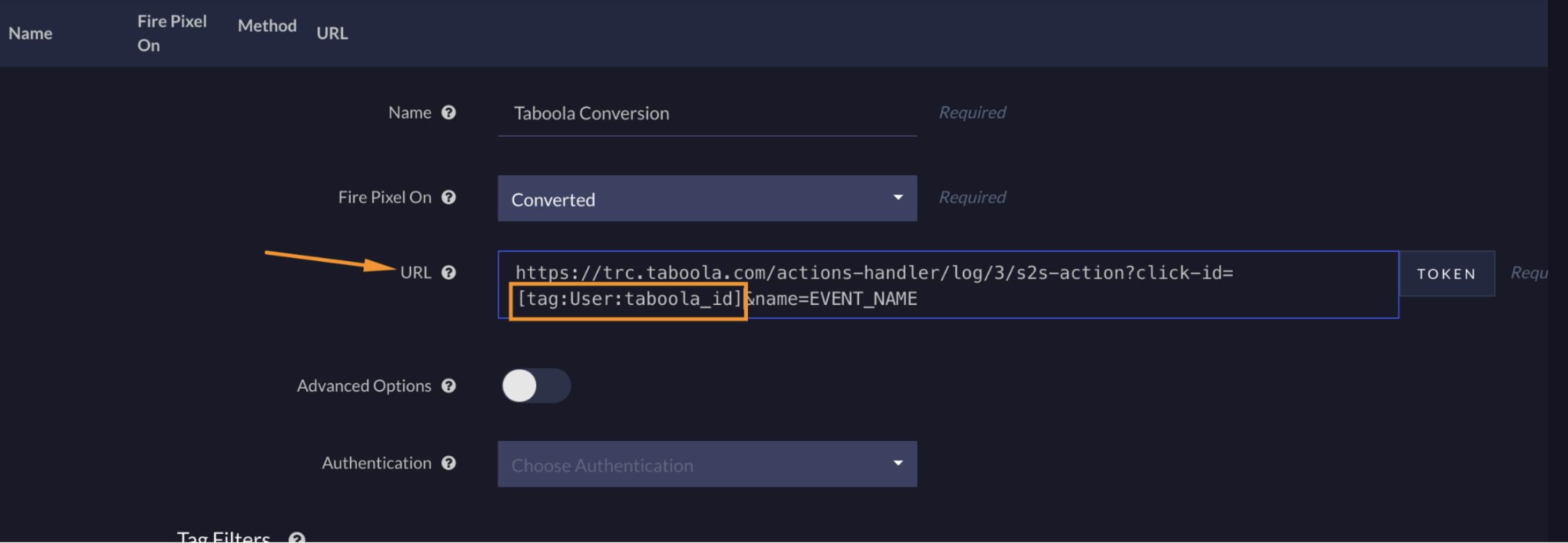 The crucial component of the setting up the pixel is to reference the Taboola Click ID or any other data required by Taboola to properly track the conversion. In the URL section, you will need to attach a dynamic element which Ringba calls Tokens in order to populate the unique Taboola Click ID when firing the pixel. The following is an example of a pixel that fires with a tag that came from a landing page. Ringba labels those tags under User tags as they were generated by the user and not Ringba's system.