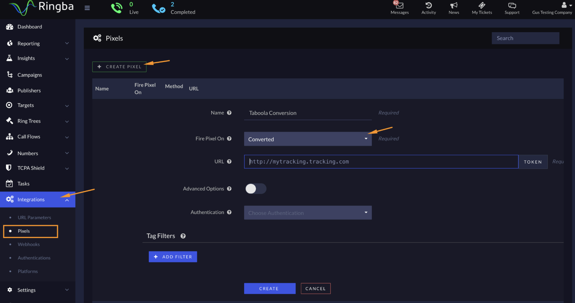 To create the pixel go to Integrations → Pixels and click on + Create Pixel. Then enter a name for your pixel and select the proper trigger to send back data into Taboola. For example, the trigger can be when the call lasts 120 seconds. For more details on setting pixels, please visit the Ringba's Help Center.