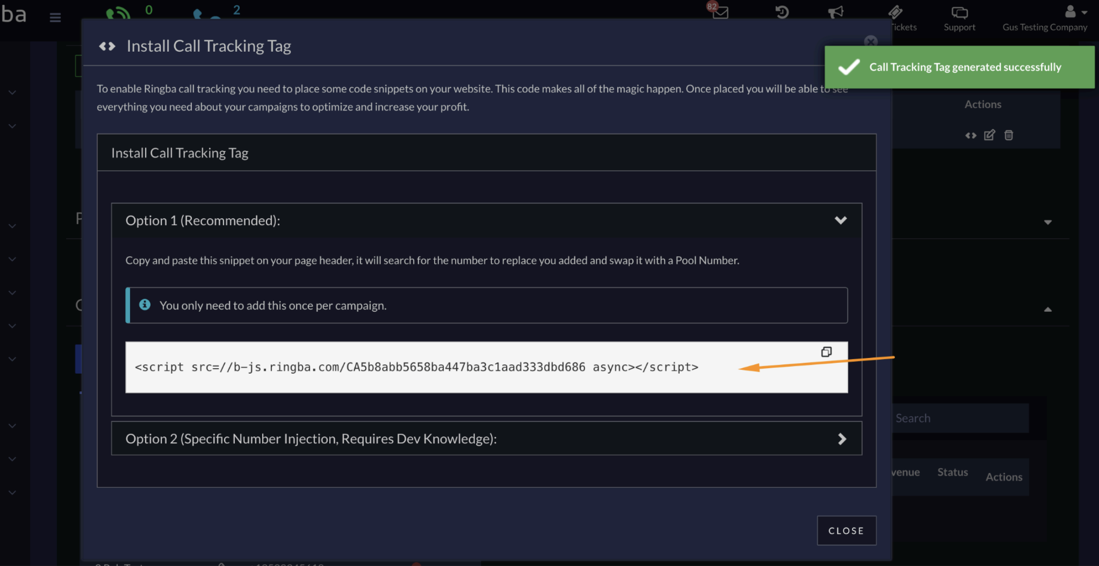 This will generate the unique JS snippet to be able to receive call tracking tags into your campaign. When you generate the script it will be immediately shown as in the image below.